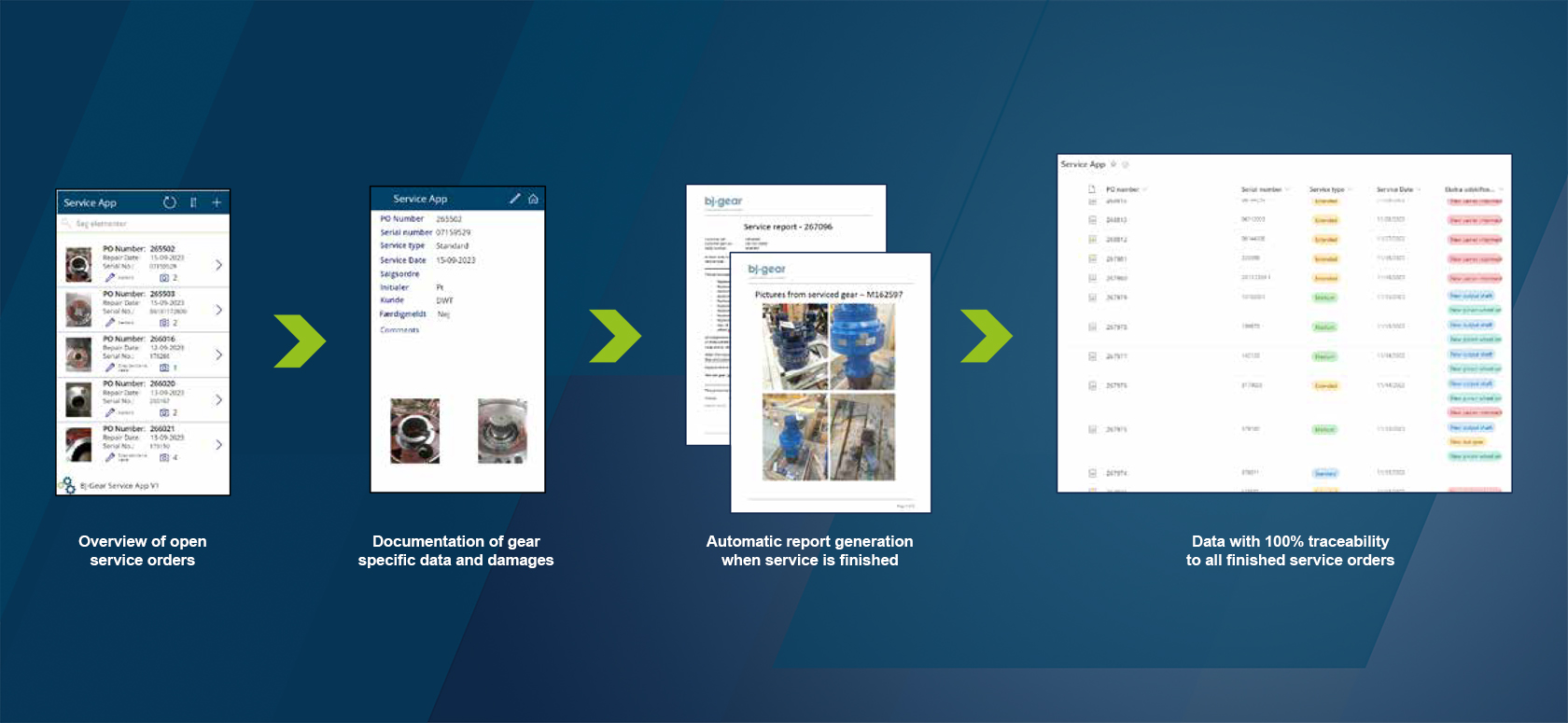 Our Experience cutting-edge service app is designed to streamline the service process and documentation and offers 100% traceability to your specific order. From managing open service orders to documenting gear-specific data and damages, our app ensures transparency and efficiency every step of the way. Plus, with automatic report generation upon service completion, you can easily track the progress of your refurbishment project.